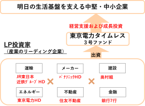 「事業会社に信頼されるファンド」を実現するために、私たちは東京電力ホールディングスと共同で当社を設立するとともに、各産業の大手事業会社をLP投資家に招き、大手事業会社の協力を得て中堅中小企業の支援を行うファンドを設立しました。
